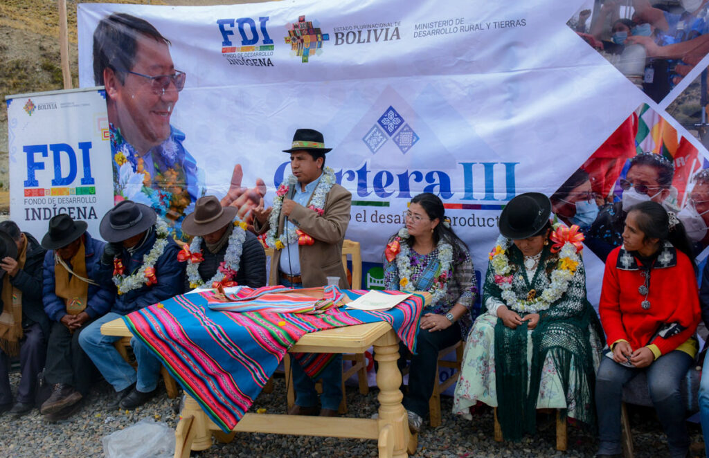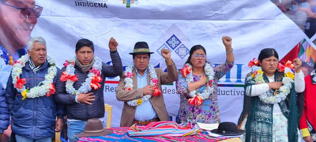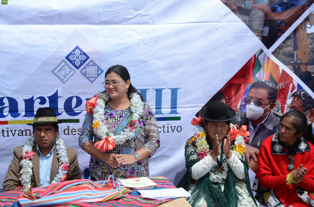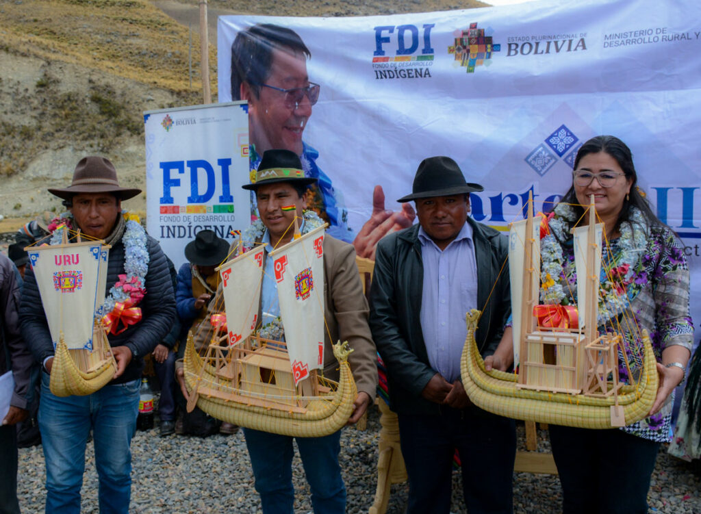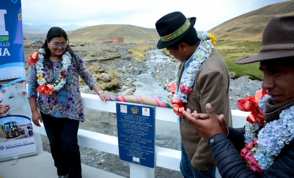Este martes la directora General Ejecutiva del Fondo de Desarrollo Indígena Lic. Delicia Rossio López Tolaba, y el Vice Ministro de Desarrollo Agropecuario Álvaro Mollinedo, llegaron al municipio de Huarina, comunidad Coromata Alta, para hacer la entrega del puente vehicular rio Layuni – Huarina, mismo que beneficiará a varias comunidades del sector para que puedan trasladar sus cosechas a distintos puntos del país.