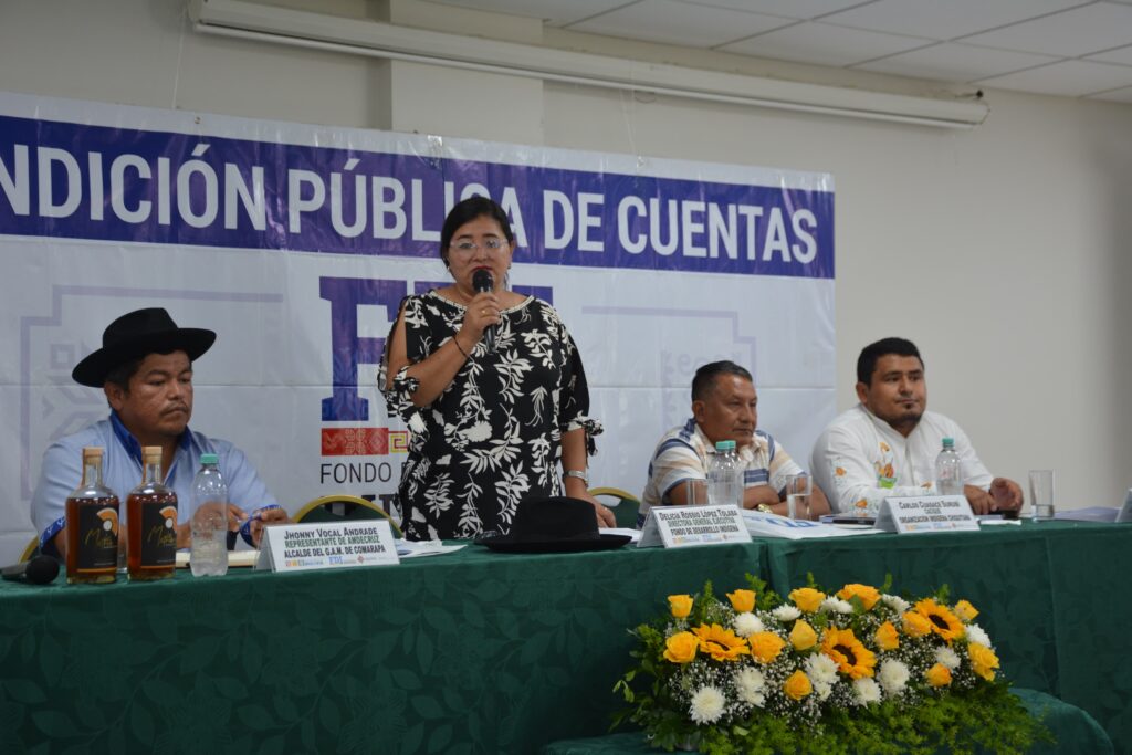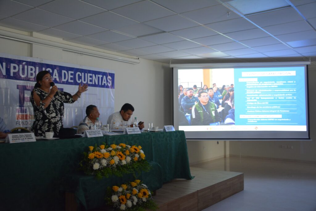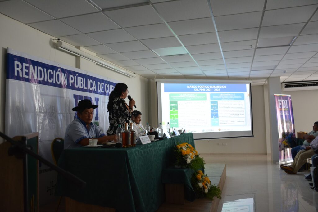 La Asociación de municipios del departamento de Santa Cruz fue el escenario donde se llevó adelante la “Audiencia de Rendición Pública de Cuentas Final Gestión 2024” modalidad virtual y presencial del Fondo de Desarrollo Indígena, a la cabeza de la Directora General Ejecutiva Lic. Delicia Rossio López Tolaba, con la presencia de autoridades municipales, alcaldes, dirigentes de organizaciones sociales, delegado presidencial, juntas vecinales e invitados especiales.
