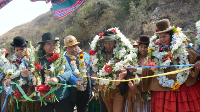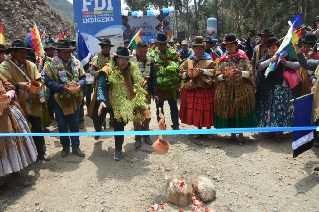 Palca, 26 de octubre (Prensa FDI). – El ministro de Desarrollo Rural y Tierras Ing. Remmy Rubén Gonzales Atila, y la directora General Ejecutiva del Fondo de Desarrollo Indígena Lic. Delicia Rossio López Tolaba, llegaron al municipio de Palca, comunidad Coquecota, para hacer la entrega de 3 puentes vehiculares “Construcción puente vehicular Rio Molienda – Cerro Negro”, “Construcción puente vehicular Tahuapalca”, “Construcción puente vehicular Choquecota”.
