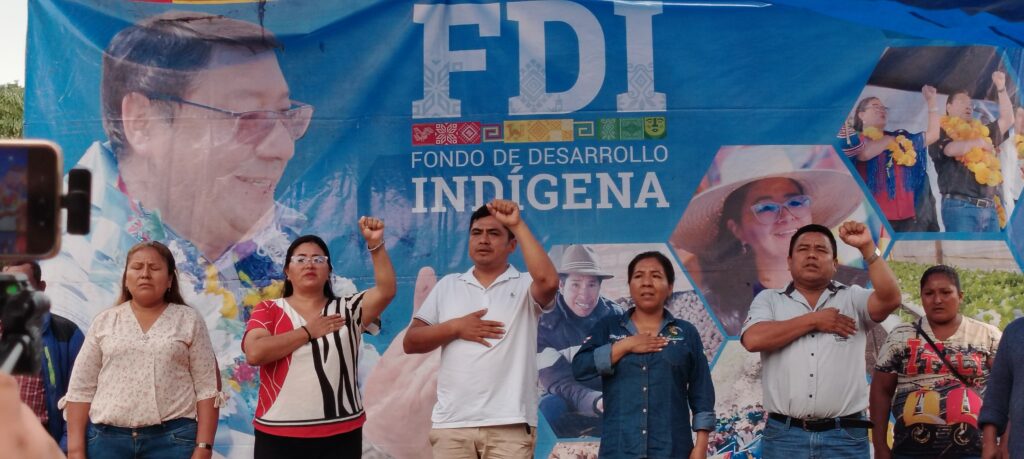 La directora general ejecutiva del Fondo de Desarrollo Indígena Lic. Delicia Rossio López Tolaba junto a autoridades municipales, dirigentes de organizaciones sociales y beneficiarios, entregó la maquinaria que tiene por objetivo de contribuir y mejorar la calidad de vida en el marco de la seguridad alimentaria de 248 familias beneficiarias aprovechando los recursos hídricos provenientes de las precipitaciones y obras de almacenamiento de agua en el municipio de El Puente.