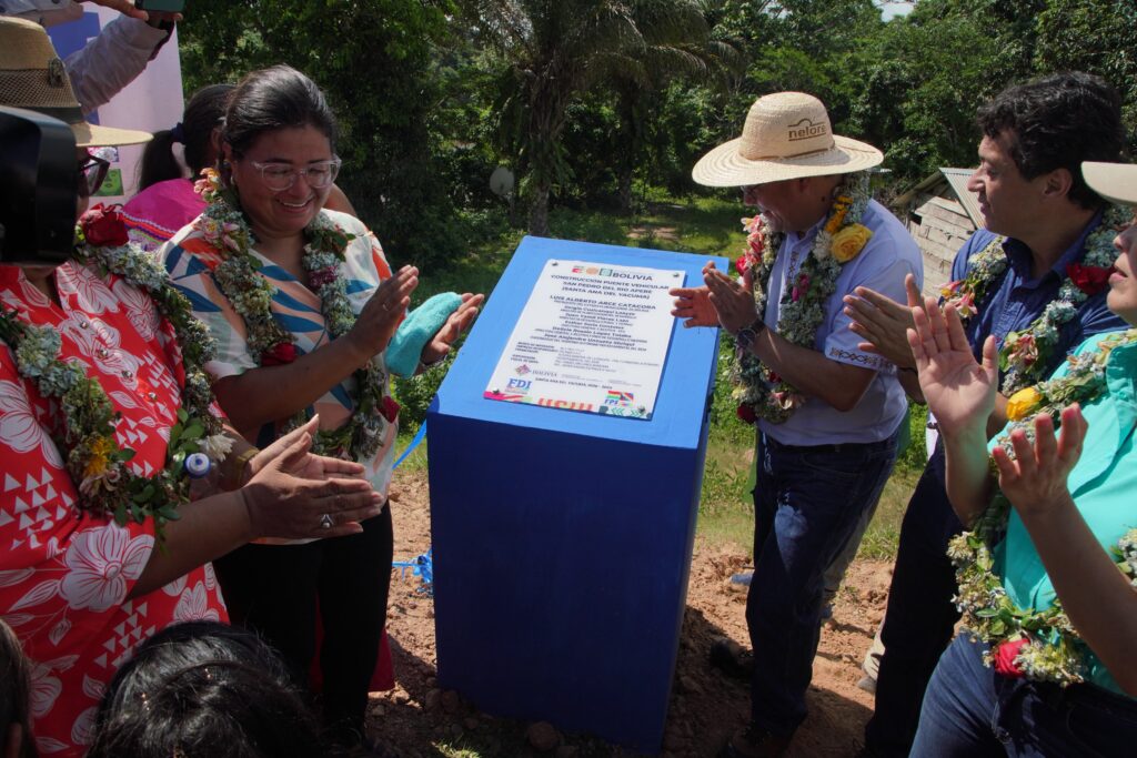 FDI | Santa Ana del Yacuma, Beni – 29 de nov. 2024. – En el municipio de Santa Ana del Yacuma, provincia Yacuma del departamento del Beni, se inauguró el puente vehicular San Pedro de Río Aperé, una obra clave que fortalecerá la conectividad y dinamizará la economía local. Con una inversión total de Bs. 6.972.696,57 —financiada en su mayoría por el Fondo de Desarrollo Indígena (FDI) con Bs. 5.664.647,00 y una contraparte del Gobierno Autónomo Departamental del Beni de Bs. 1.308.049,57— esta infraestructura beneficiará directamente a 200 familias productoras de la región. La construcción de este puente, de 81,80 metros de longitud y 4,50 metros de ancho, garantiza el tránsito vehicular durante todo el año, facilitando la conexión entre la comunidad de San Pedro de Río Aperé y los centros poblados del municipio y del departamento.